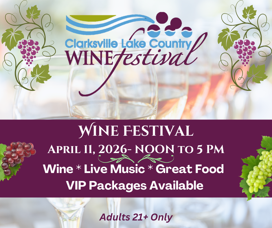 Register for the 20th Annual Clarksville Lake Country Wine Festival to be held on Saturday, April 11, 2026.