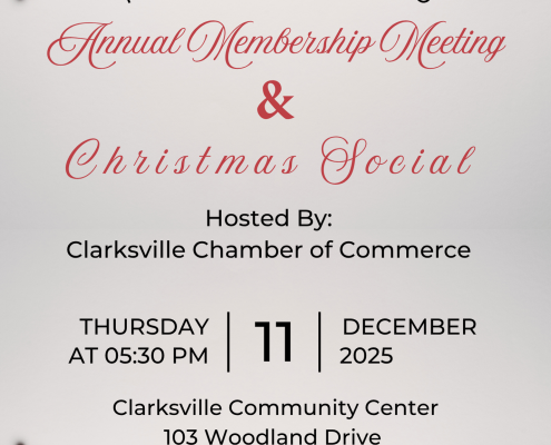 Events, NewsThe Annual Membership Meeting and Christmas Social is Thursday, December 11, 2025 beginning at 5:30pm at the Clarksville Community Center.